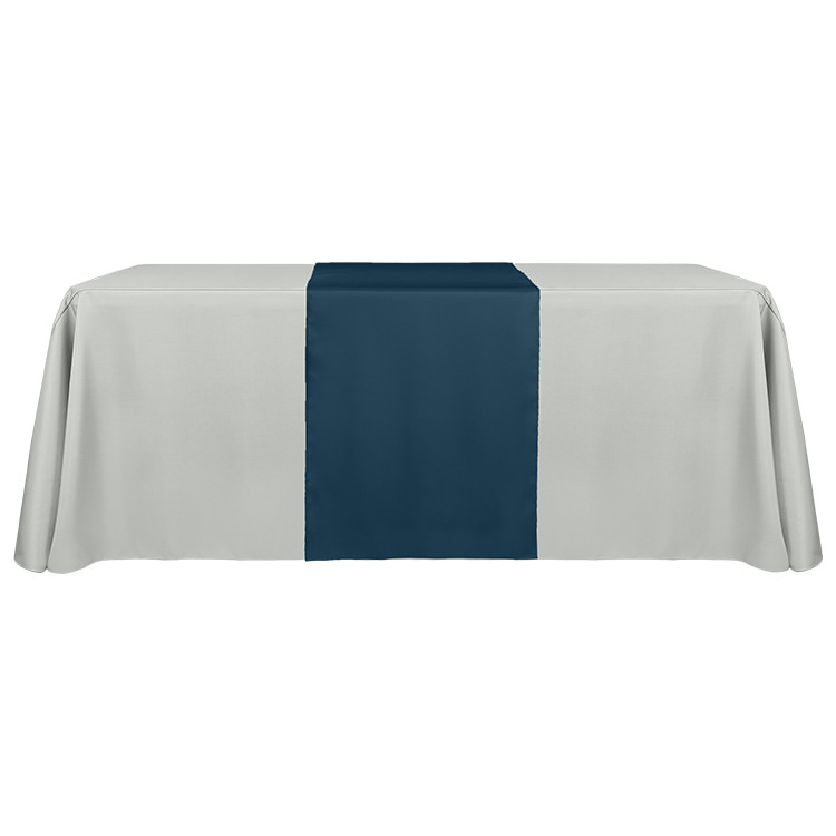 100% polyester; Liquid-repellent for an easy cleanup process; Stretchy fabric for a professional look; Resistant to stains, flames and wrinkling; Serged edges to help prevent fraying; Foldable and washable; Includes a free drawstring bag; Your full-color design on the entire table runner
