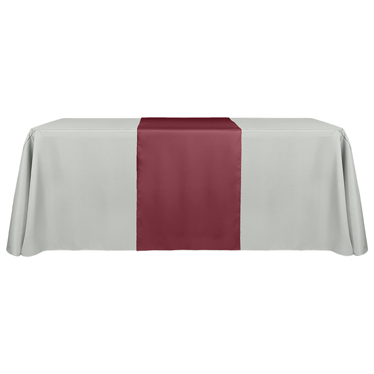 100% polyester; Stretchy fabric with serged edges for professionalism and style; Resistance to flames, stains and fraying; Liquid- and wrinkle-repellent material that's washable; Your customized logo on the front panel; Easy to store items underneath; Includes a free drawstring bag; Open back and rounded corners to prevent bunching