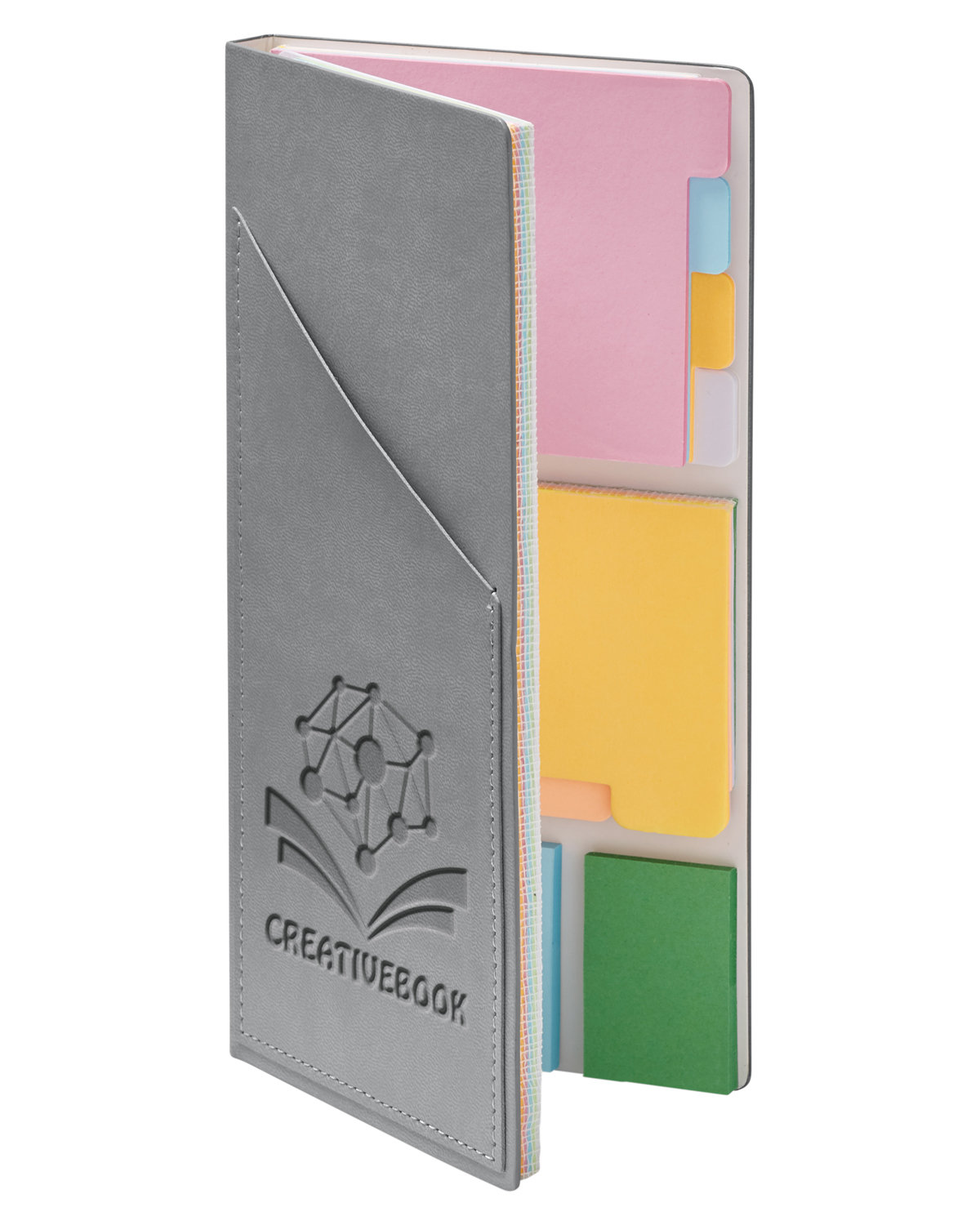 Pocket-sized sticky note book featuring a recycled cardboard cover with die-cut smiley face made from 65% recycled materials (part is pre-consumer and part is post-consumer). Includes one 3" x 3" yellow sticky note pad with approx. 20 sheets and five sticky page marker strips with approx. 20 flags each.